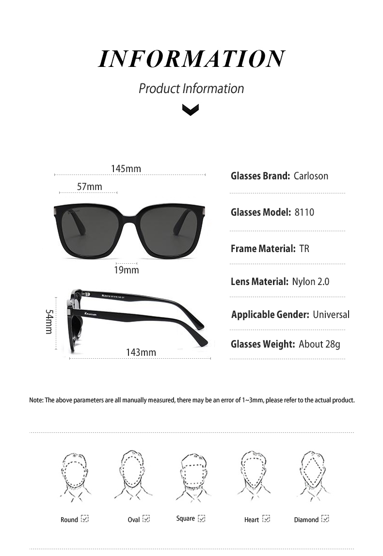 - Recommendation: These glasses offer a sophisticated and classic style that fits both men and women with heart and oval face shapes. Ideal for those seeking an elegant and effortless look, the square frame adds a distinguished touch to any outfit.